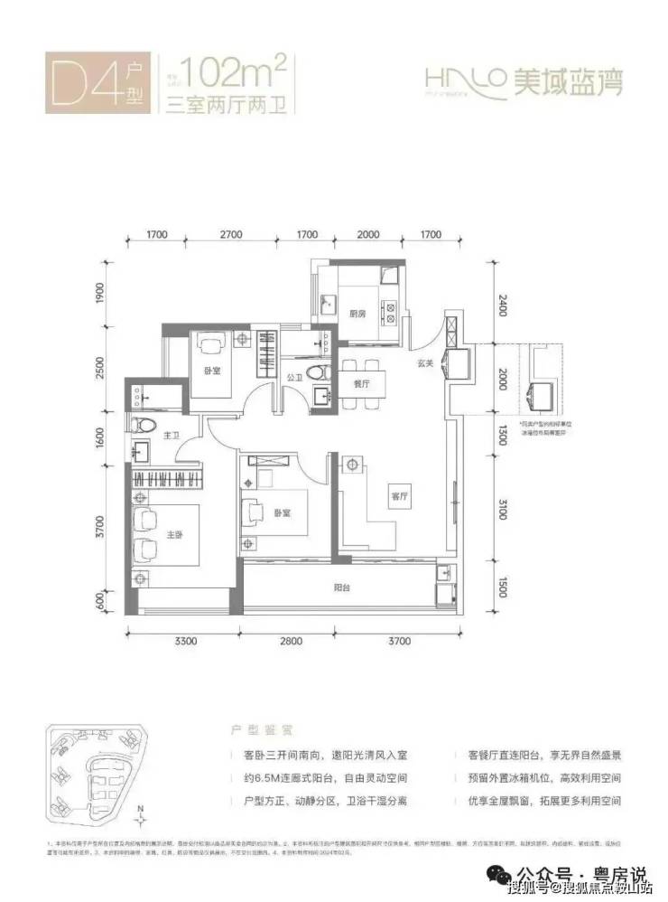 102㎡的3房2厅2卫,D4户型,经典竖厅格局,客厅3.7米开间,LDKB一体化设计,S墙设计预留冰箱卡槽位,U型厨房,卫生间干湿分离,三开间朝南,客厅连接次卧出6.4米长的观景大阳台约9.75m²,东南朝向看小区园林,得房率约75.3%(不含赠送),加上赠送得房率83.97%。