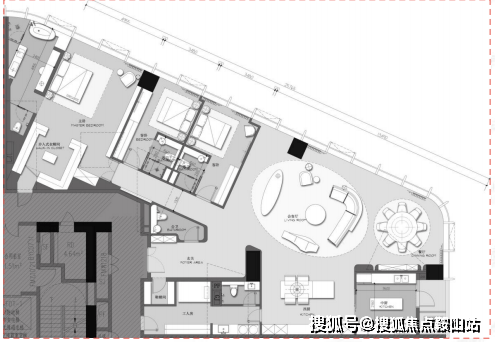 建筑面积约 439㎡,为 3 + 1 房 2 厅 2 厨 5 卫布局。该户型由 LSD 亲自操刀设计,拥有 270°城市与绿化景观,高区可看海景。采用全套房、双主卧设计,客餐厅开间超 10 米,方正主卧面积达 24㎡且为明卫设计,次卧带阳台,中西厨结合,还有多功能房,空间灵活多变。