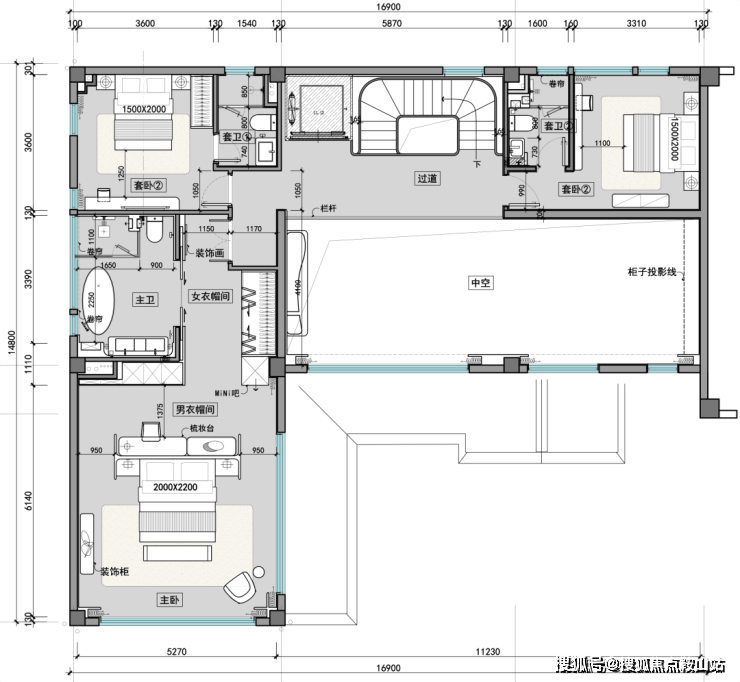 二层卧室布局错落有致,挑空区丰富空间层次;