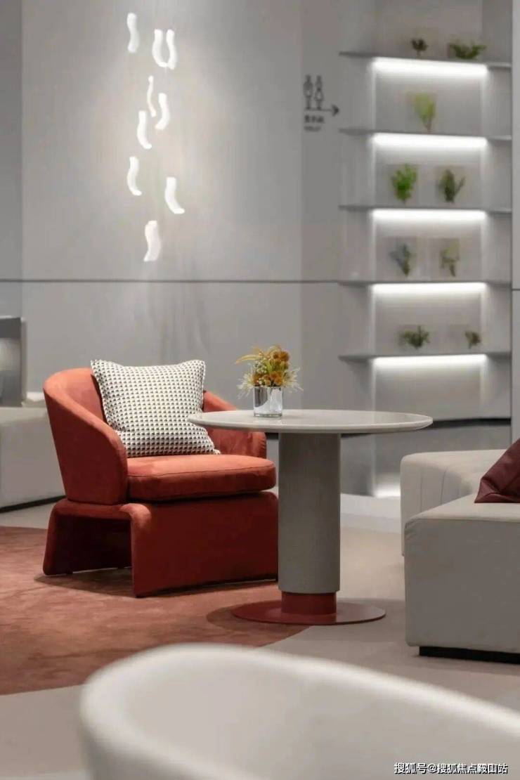 场域内无间设计,让社区生活场景愈加多元。红棕色的丝绒单椅与抱枕、雅白的弧形沙发、拼色几何图形地毯,光影游走其中,定格朝夕守望的瞬间。