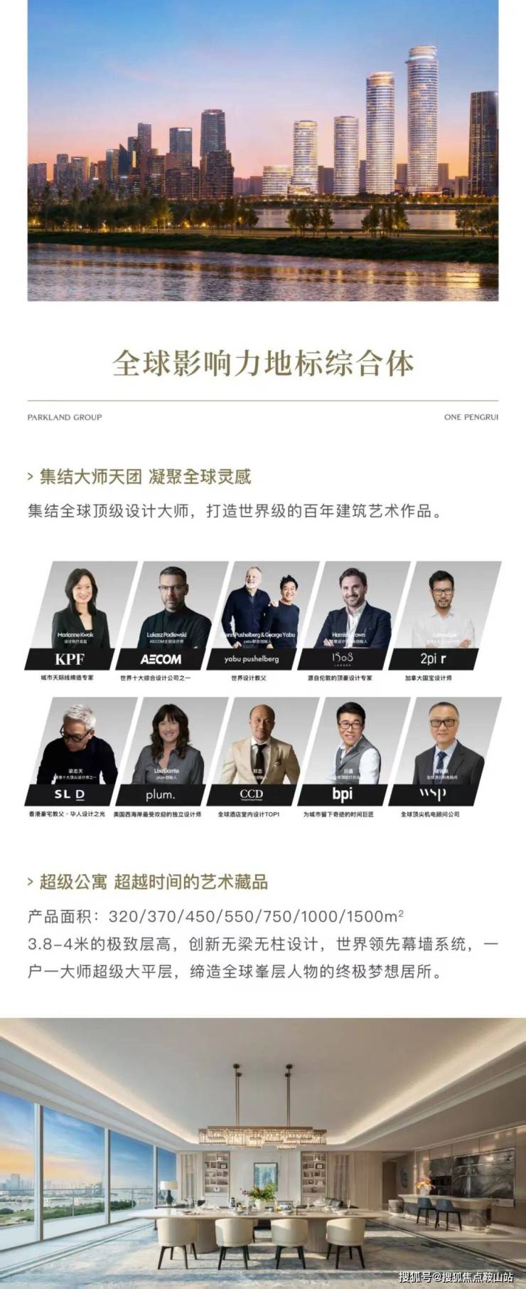 2.项目介绍:项目总共规划有6栋建筑,涵盖了顶奢公寓、传奇奢华酒店、湾颂·艺术中心、广州·深湾会、湾汇高定商业中心等。分为南北两区,南区为T1/2/3/4,北区为T5/6。T1栋总高12层(公寓):3-10层 :建筑面积 750平 11-12层:顶复建筑面积约2000平T2/3栋总高32层(公寓):4 -9层: 370、320、320平11-20层: 450、550平22-30层: 450、550平31-32层: 顶复约 1500平T4栋总高4-5层(艺术中心)音乐表演、艺术展览、室内竞技等多功能T5、T6栋分别是52层和59层商业商务大楼广州·鹏瑞1号,作为鹏瑞集团继深圳湾1号后的又一力作,致力于打造“中国仅有、世界少有”的全球影响力地标综合体。